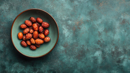 A vibrant turquoise plate filled with fresh dates on a textured background. Ideal for health-related themes, culinary uses, and natural food presentations.