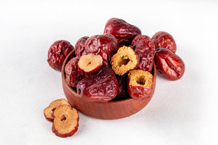 Bowl of dried red unabi or jujube berry fruits, healthy asian fruit, Chinese dates halfed and whole on white background