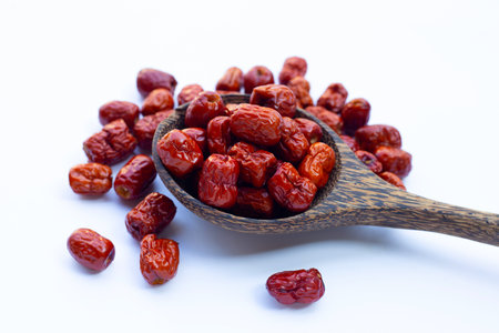 dried unabi fruit or jujube in wood spoon of on white background. copy space for text.