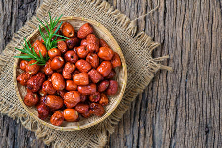 Dried Jujube, Chinese dried red date fruit in bamboo basket on old wood background,herbal fruits. It have more vitamin C Which helps fight free radicals And stimulate the immune system