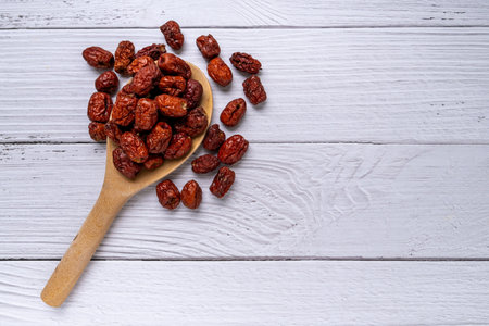 Dried jujube in wooden spoon on white wood background. The fruit is a traditional Chinese herb. Dried jujube can make healthy beverage the source of Vitamin.