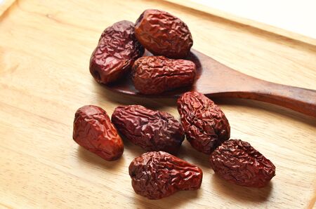 Dried chinese jujubes fruits with wood ladle on wooden table