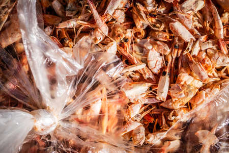 Shrimp peels in a torn plastic bag. Leftovers from the meal. Selective focus.