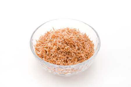 Small dried shrimp on a dish isolated on a white background.