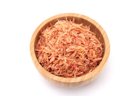 Dried shrimps in woodle bowl isolated on white background