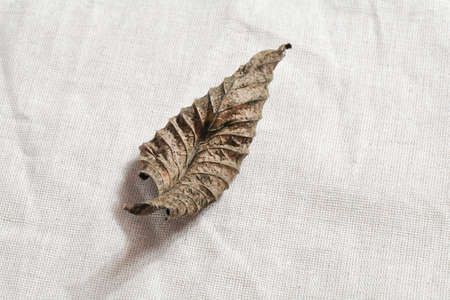 close up of dry leaf on linen textile. natural background. minimal, stylish concept. boho and kinfolk design.