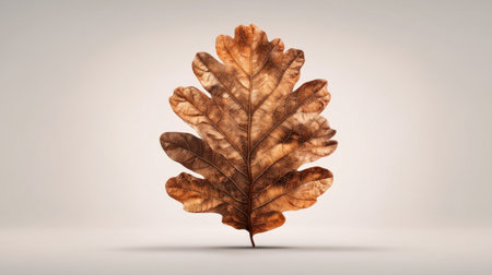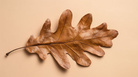 A beautifully detailed dried oak leaf positioned on a soft beige background, showcasing the intricate texture and warm tones perfect for nature-inspired design needs.