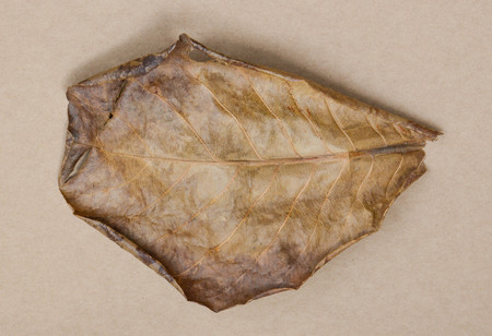 a dry, curled leaf lies on a white surface