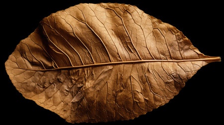 A detailed close up of a dried leaf reveals its intricate veins and textured surface, contrasting beautifully against a dark background. The natural design highlights the leaves unique features.