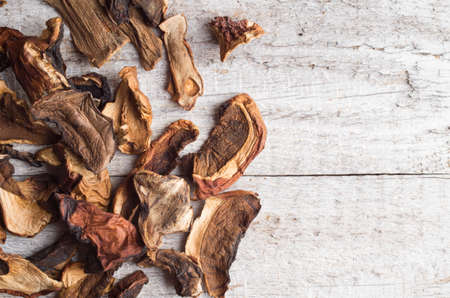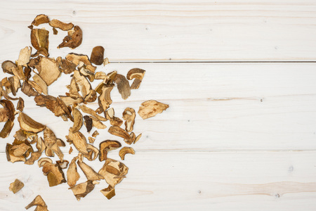 Lot of slices of dry brown mushroom boletus edulis variety flatlay on white wood