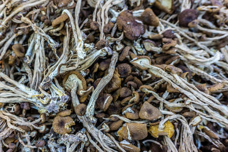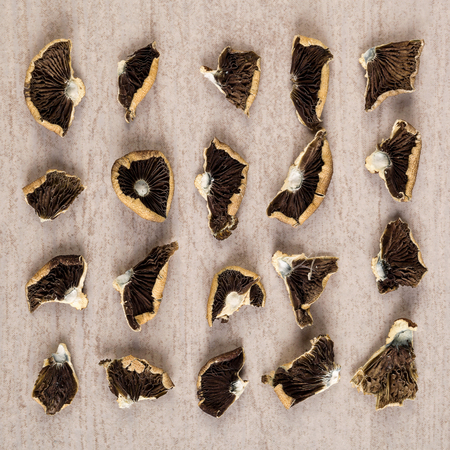 Dried magic mushrooms from above. Knolling flat lay background. Entheogen, alternative medicine.