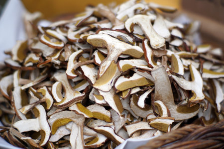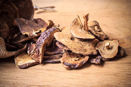 Colorful dried mushrooms, dried mushroom slices. Close up.
