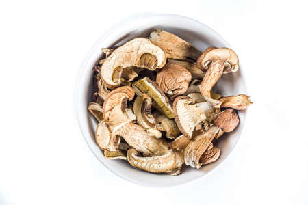 Dried mushrooms Boletus edulis (Penny bun, Cep, Porcini) isolated on white background. Ingredient for vegetarian (vegan) healthy food