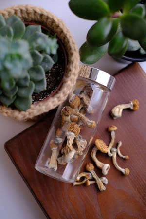 Dry Psilocybe Cubensis mushrooms in a glass jar on a wooden board surrounded by indoor plants. Life style microdosing concept.