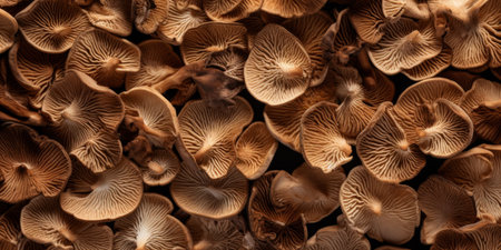 A top view of beautifully arranged dried shiitake mushrooms showcasing their earthy colors and textures, ideal for culinary and food-related themes.