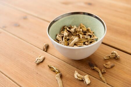 Dried shiitake mushrooms in a bowl on the kitchen table. Top view.