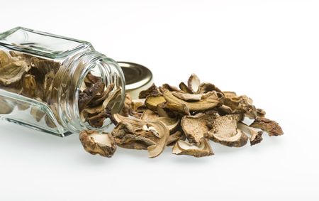 Dried Porcini Mushrooms Spilling out Of A Storage Jar On A White Background