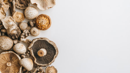 An aesthetically arranged display of various edible mushrooms and fungi on a neutral surface, ideal for culinary projects, nutrition research, and food photography.