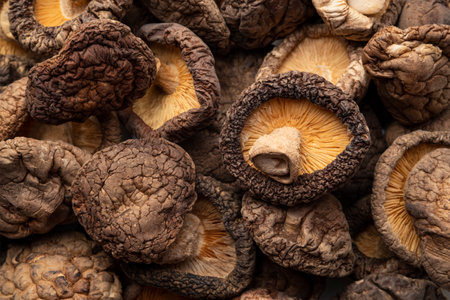 Detailed shot of dried shiitake mushrooms, showcasing their wrinkled texture and deep, rich color, emphasizing their dried and preserved state.