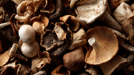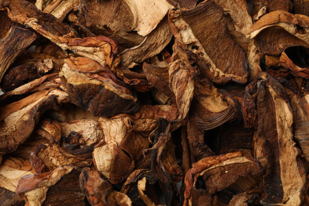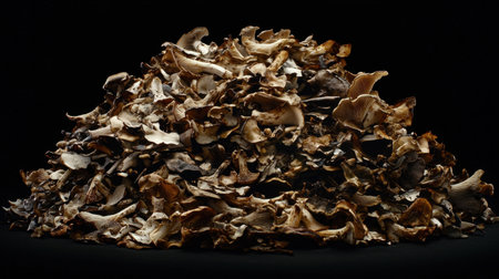 A stunning pile of dried mushroom fragments showcases an array of textures and earthy tones, perfect for culinary art or natural decoration.