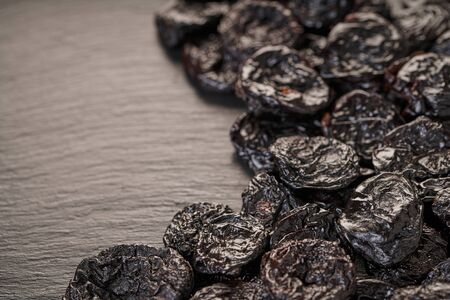 Sweet dried plums or prunes, organic dehydrated fruit for dietary nutrition. Prunes or dried plums as a food background for your design
