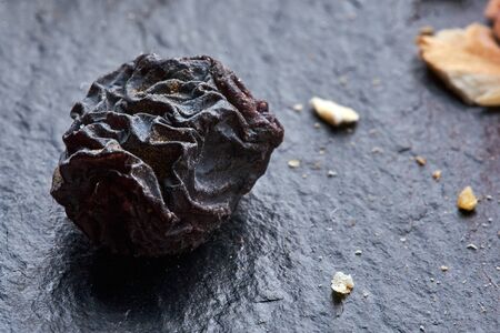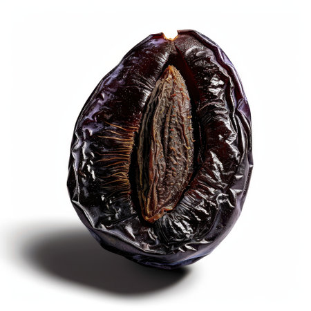 This image showcases a dried fruit with rich dark purple skin and intricate texture, highlighting its unique shape. Ideal for culinary projects, nutrition concepts, and healthy eating.