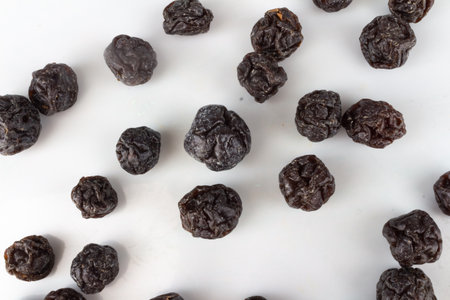 Close-up shot of dried prunes on white background showing their texture and color suggesting a healthy snack option and natural sweetness.