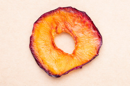 top view of dried plum slice isolated on brown paper texture background