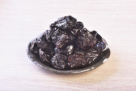organic sweet dark prunes on wooden table