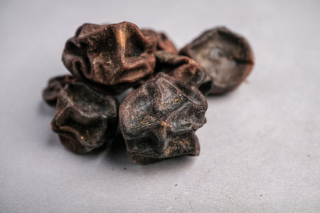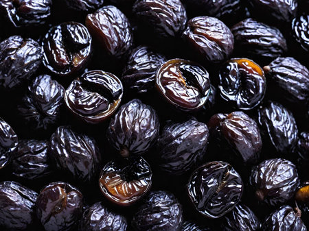 Macro Close-up of Wrinkled Dark Brown Dried Sebesten Fruit (Cordia myxa) Used in Traditional Medicine as a Demulcent and Expectorant.