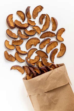 Dried apples and paper bag on white background. Top view.