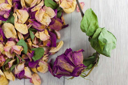 Dried Rose on old wooden background, broken heart concept