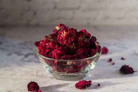 dried organic pink rose buds in a glass bowl on white table background.