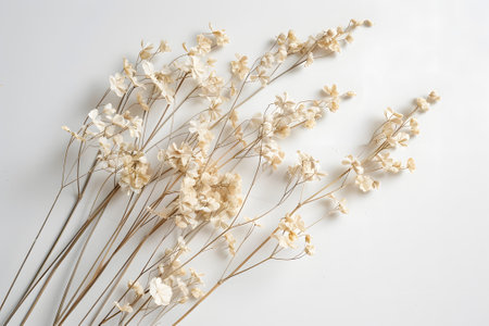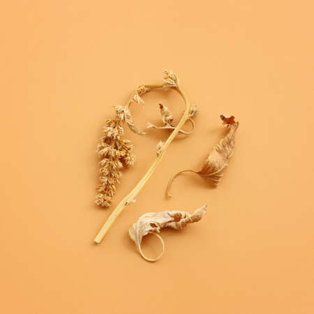 Abstract set of dried flowers on a white background, dry twigs of a lemon statice plant, top view