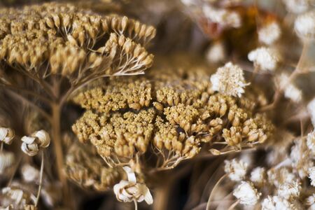 Withered yarrow in the autumn in the evening light with a blurred background and bokeh