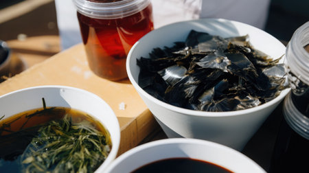 Photo of chopped seaweed and a cup of coffee and mangosteen beside it, a photo of the meaning of the drink