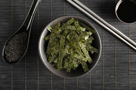 Roasted seasoned seaweed chaban salad with sesame seeds in background. Top view, close up