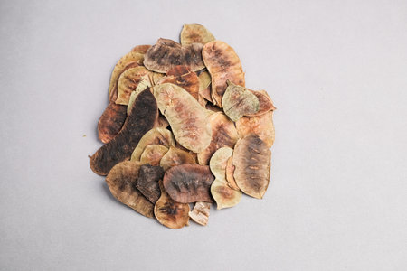 Lot of whole brown winged achene samara flatlay on grey stone