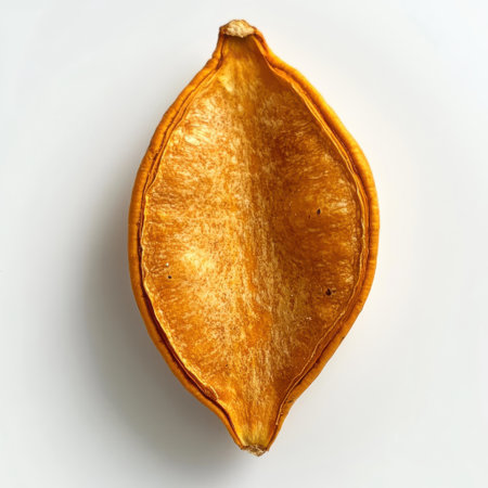 Detailed macro shot of a sunflower seed with a cracked shell, highlighting texture and structure against a vibrant orange background.