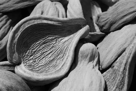 Close up of dried cardamon seed on light background with shadows.