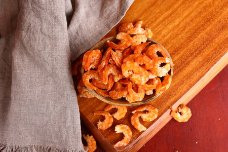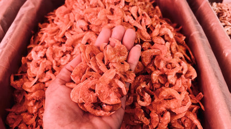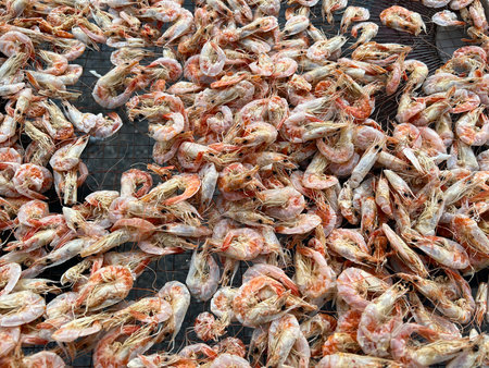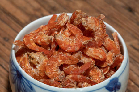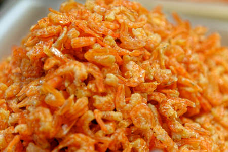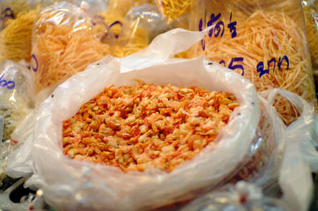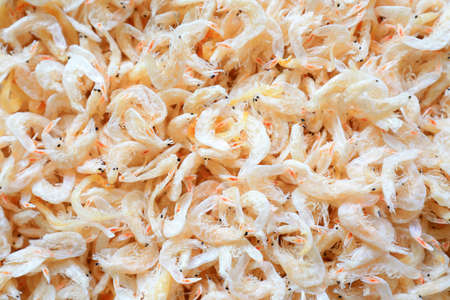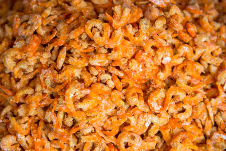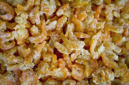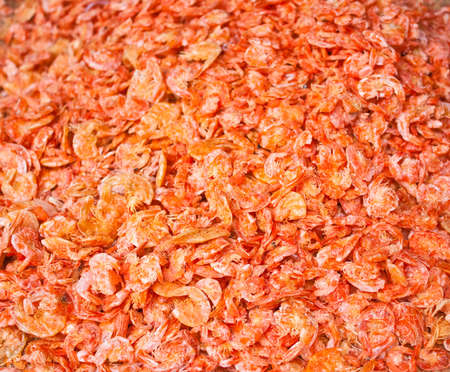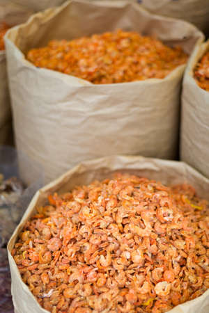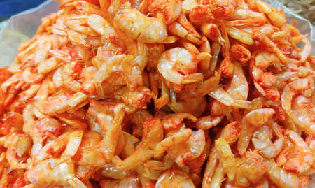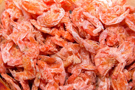 Dried prawns sold on the market. Dried Red shrimp have firmer meat, sweet taste and strong aroma