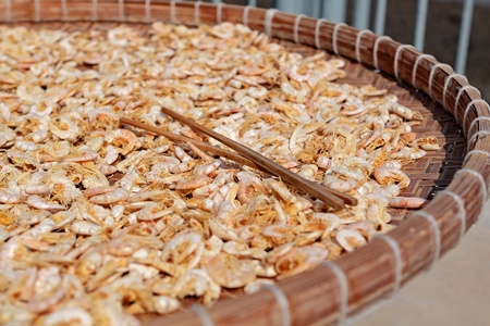Dried shrimp in a tray at local market, Dong Dong, Phu Quoc