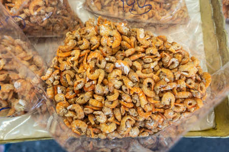 Orange dried shrimp in bags for sale in the market, Thailand.