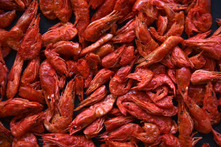 Lots of red delicious shrimp as background. Appetizer of dried peppered shrimp on a black background. The appetizer is salty with beer.