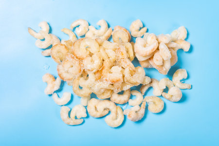 Traditional asian seafood dried orange prawns in spoon on blue background macro