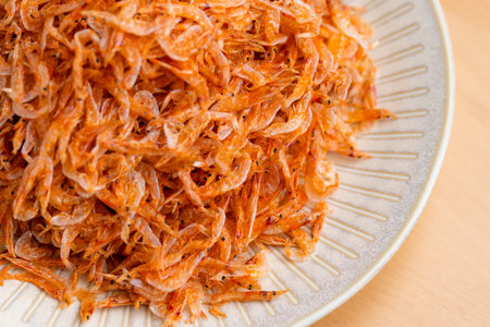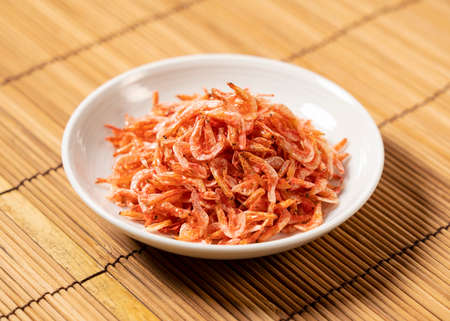 Dried sakura shrimps on a plate placed on a bamboo luncheon mat. Image of Japanese food.