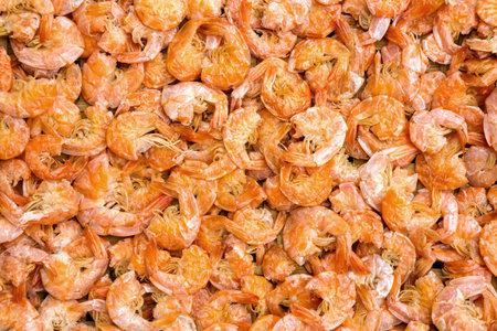 Chon Buri, Thailand - March 16, 2019: Closeup of heap of small orange-yellow shrimp on display at street market in Sukhumvit Road.