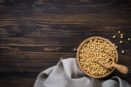 Organic Soybean in basket on wood table. Protein nutrition ingredient for vegetarian.