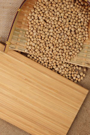 Soyabeans soya beans flowing bamboo sieve wooden board copy text space on jute background