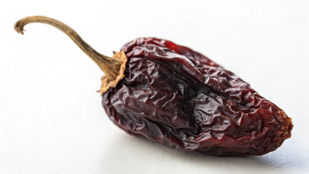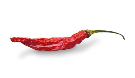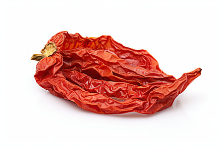 A striking image of a dried red chili pepper against a clean white background, showcasing its rich color, unique texture, and natural beauty for culinary inspiration.